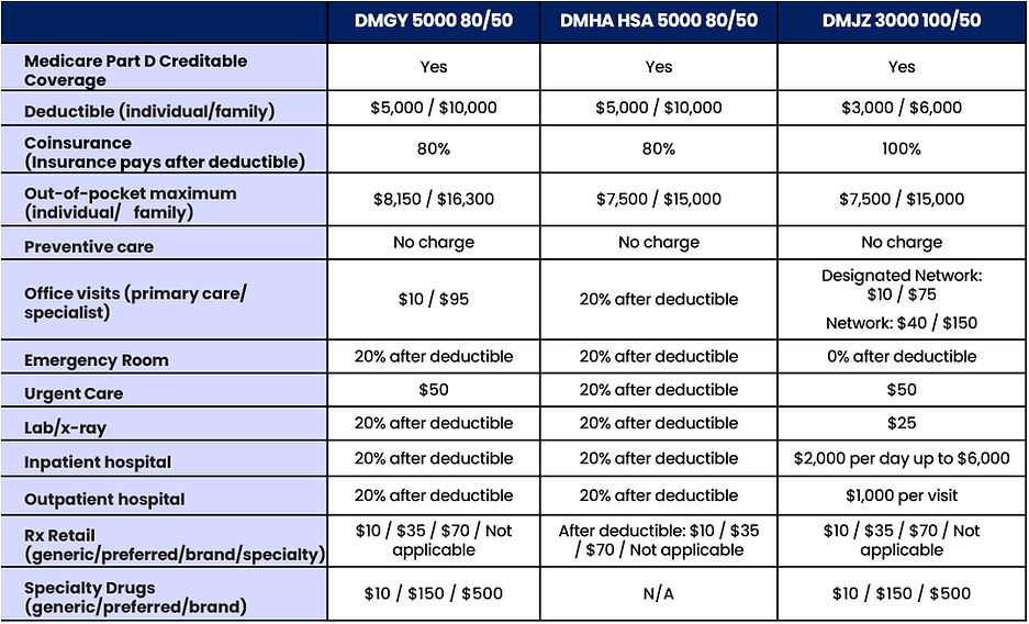 * Deductible and Out of Pocket Maximum is on a Calendar Year Basis. Out of Pocket maximum includes deductible and coinsurance, when applicable. Please refer to Summary of Benefits & Coverage (SBC) for details.